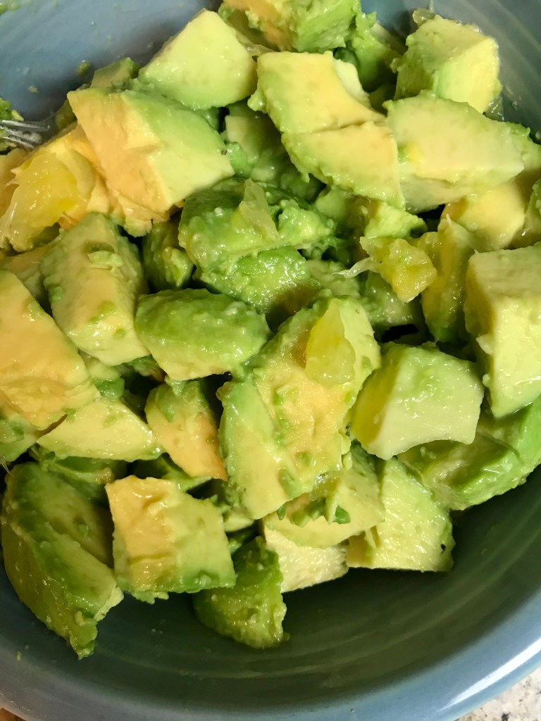 2) Toss diced avocado gently in juice from 1/2 orange. Set aside.