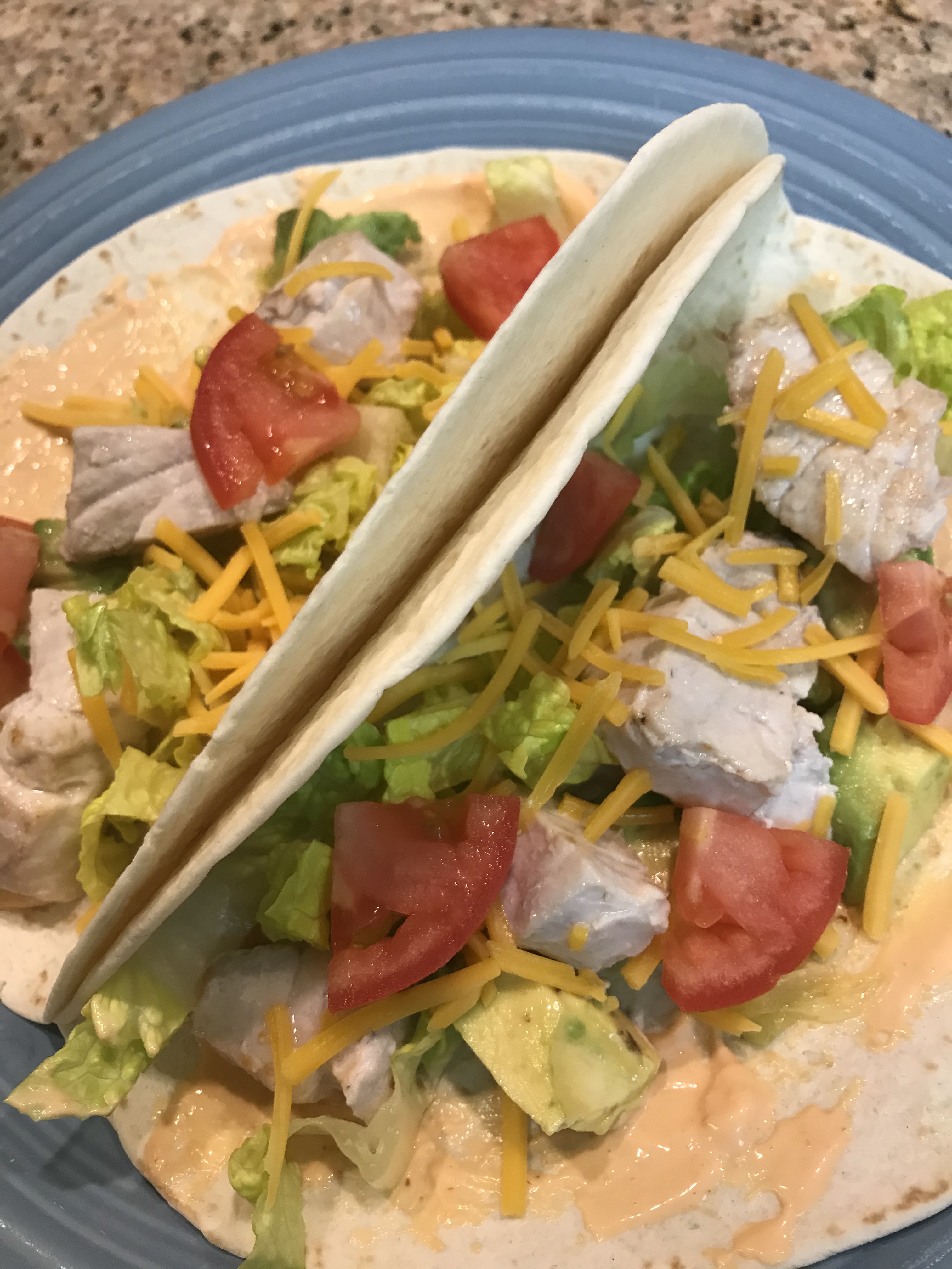 4) To assemble your amberjack tacos, first spread some of the creamy sriracha on each tortilla. Top with lettuce and avocado. Add 5 or 6 pieces of cubed amberjack. Garnish with diced tomato and a sprinkle of cheese.
