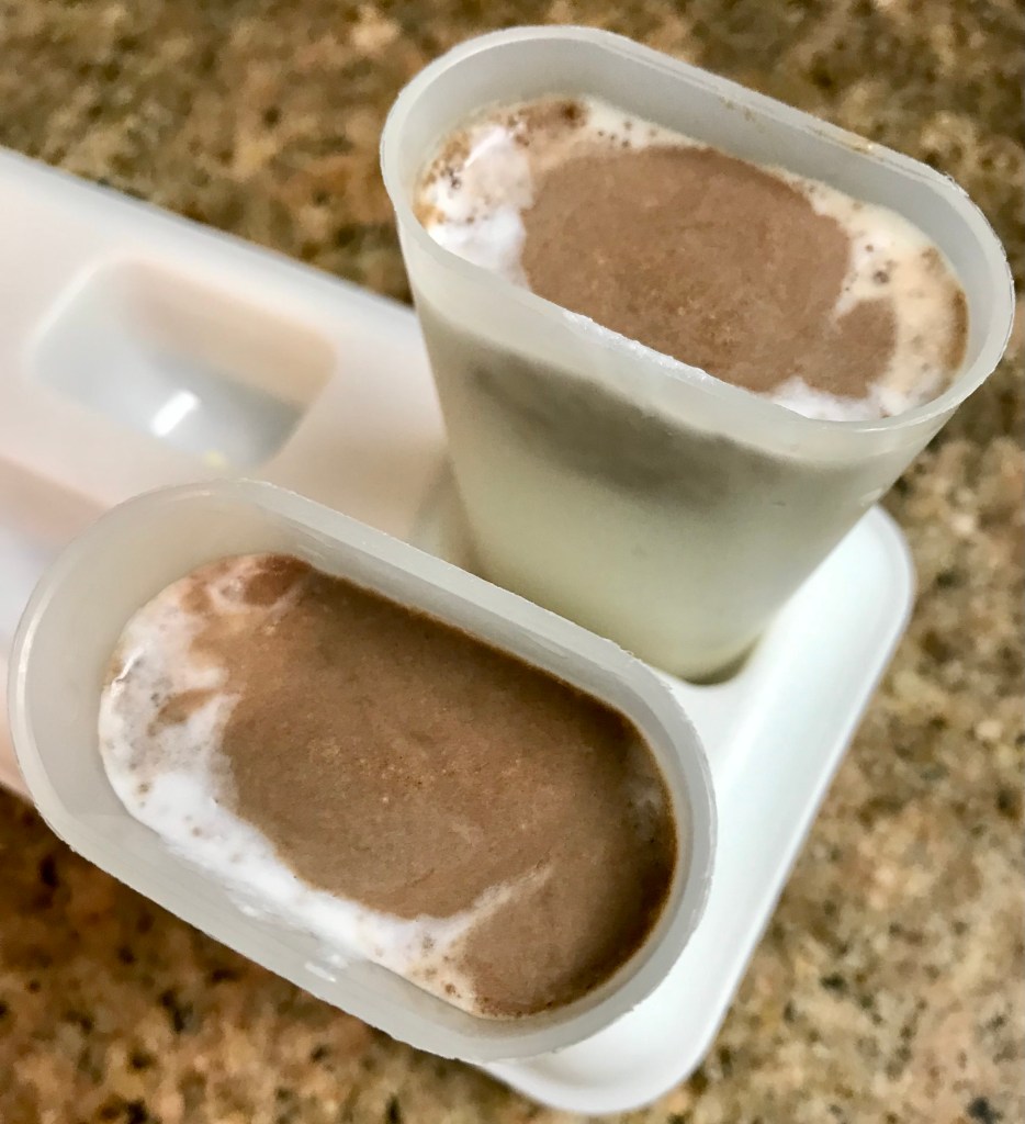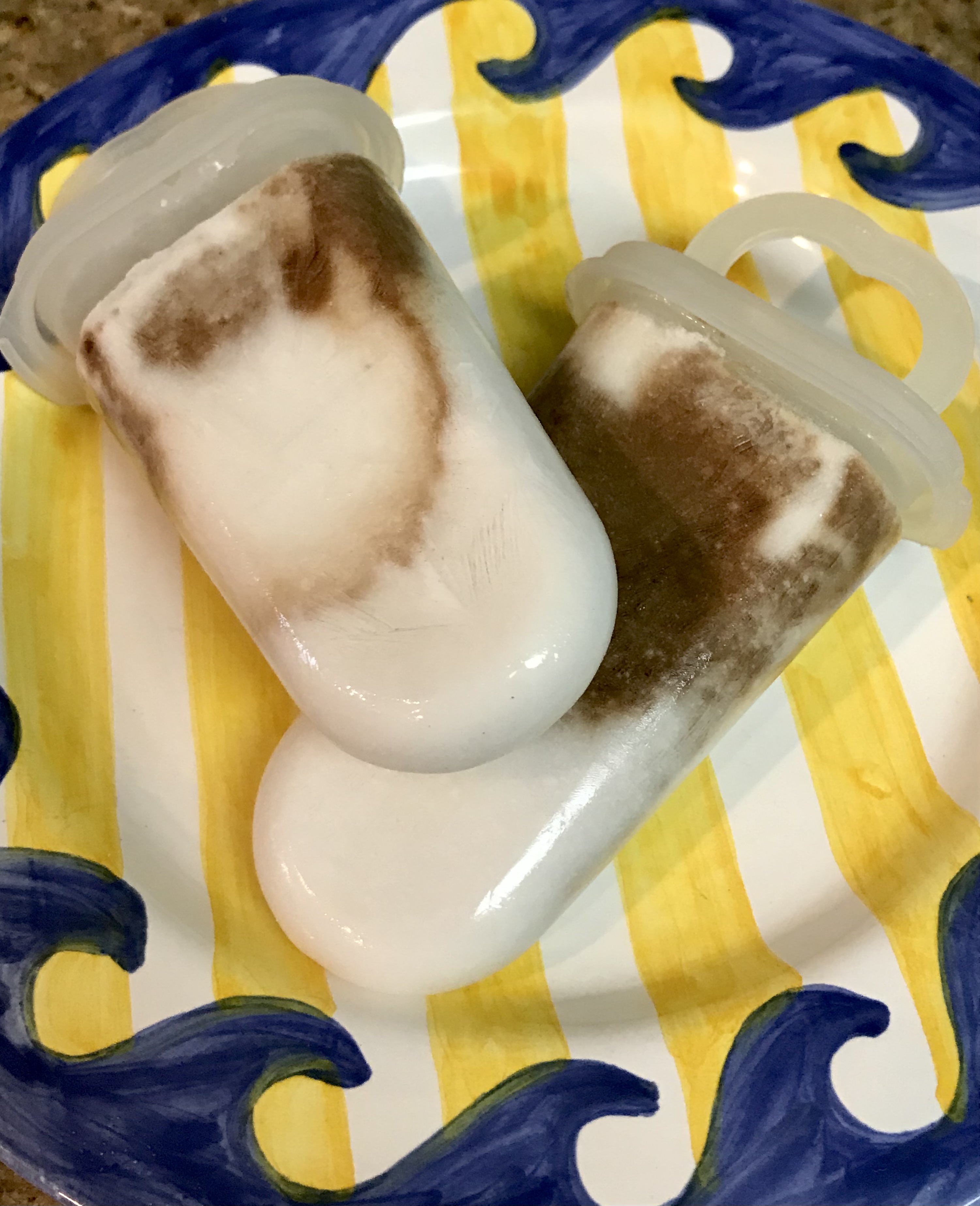 Today at Crowded Earth Kitchen we are sharing an idea rather than a recipe, because really friends, these popsicles only contain two ingredients. Simply pop open a can of coconut milk, pour about 1/4 of the can in a small bowl, and whisk 1 generous teaspoon of pure cocoa powder into that small bowl. Then, fill your popsicle molds 1/3 full with coconut milk right from the can. Drizzle a bit of cocoa-enhanced coconut milk into each mold, and repeat until the molds are full. One can of coconut milk will fill 6 to 8 popsicle molds, depending upon the size of your molds (mine hold 1/4 cup each). Place filled popsicle molds in freezer, and enjoy when firm.