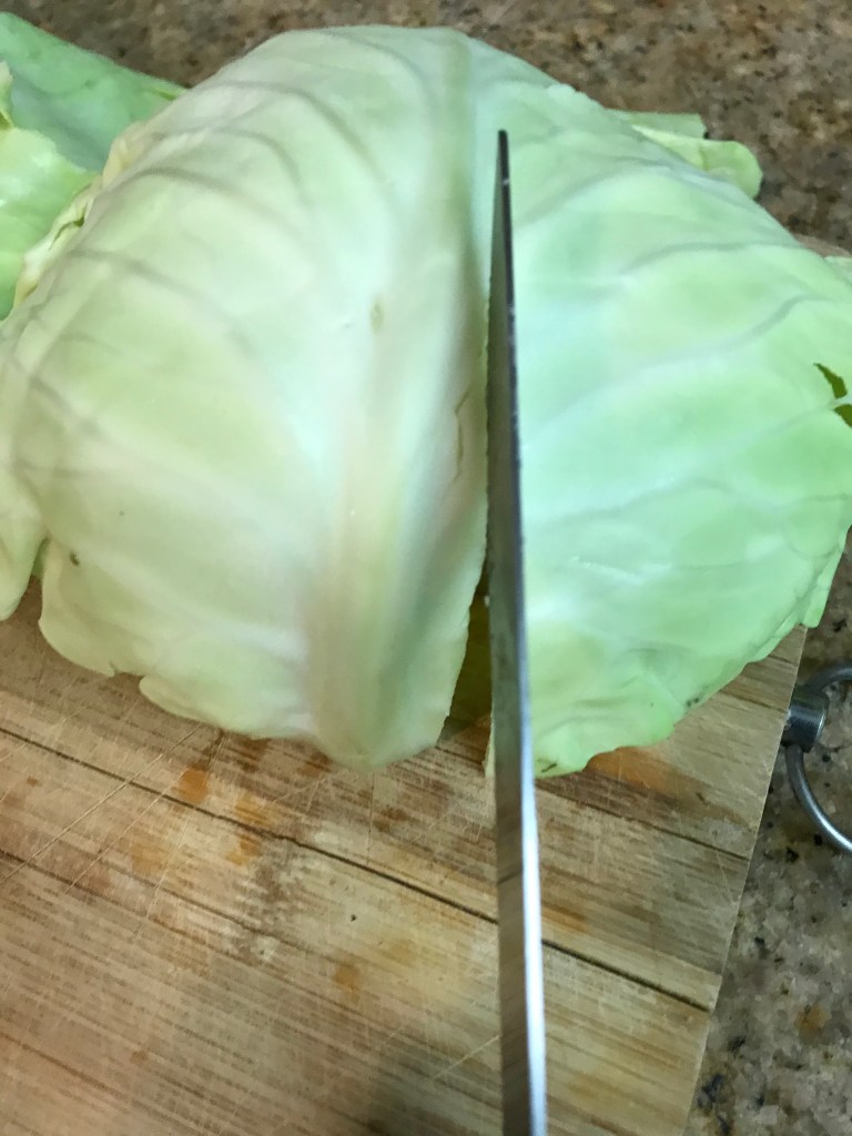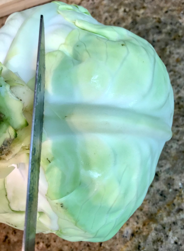 Step 3) Scoop about 1/4 cup of shrimp mixture onto each deveined cabbage leaf (see below). It’s easier to fold or roll the cabbage leaves as you eat them. I recommend serving these open-faced, as shown at the top. Enjoy!