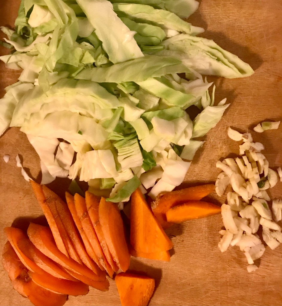Step 2) Set timer for 2 minutes. After 2 minutes, add cabbage, carrot, and garlic to the pot of boiling water and noodles.