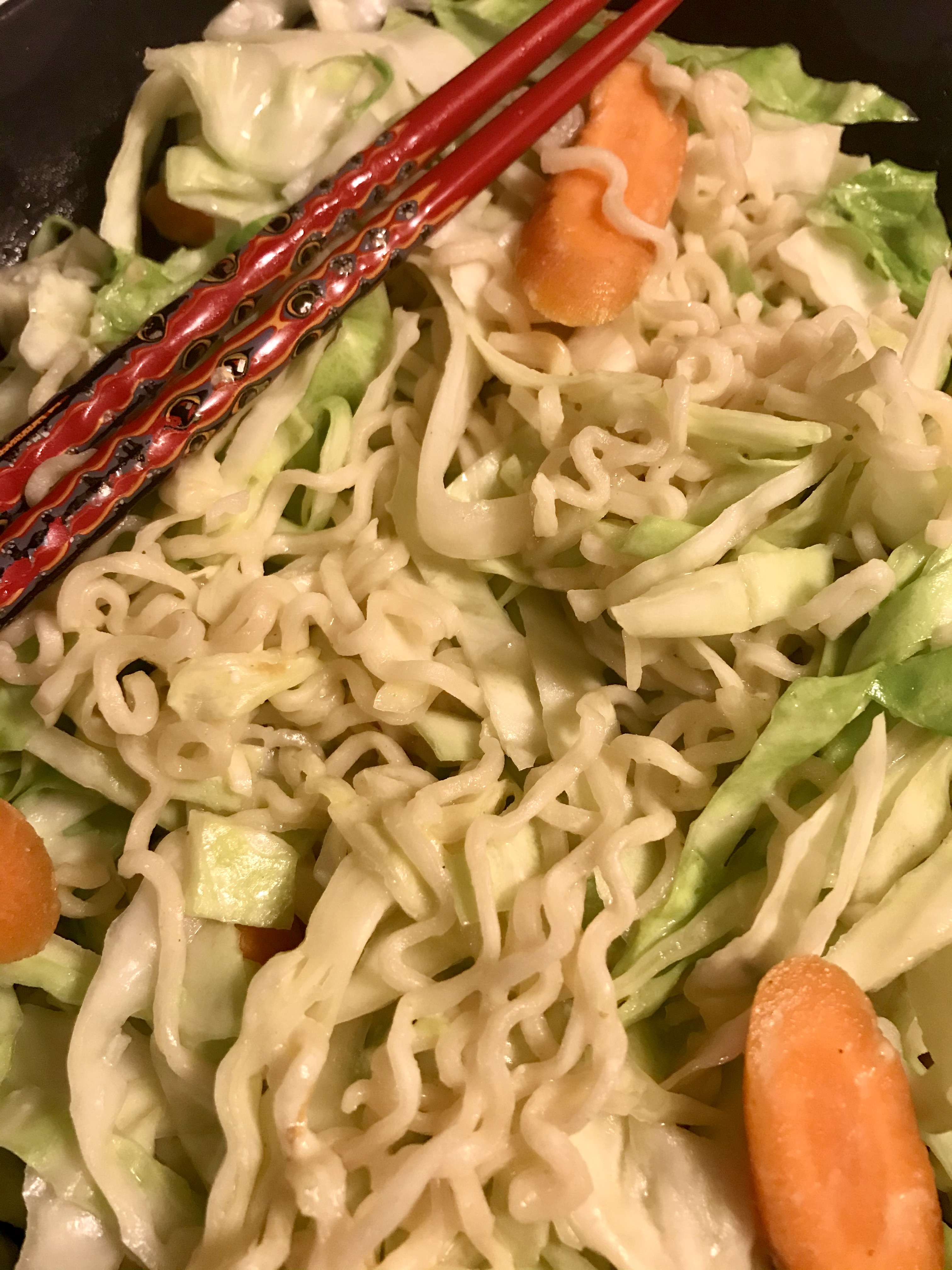 Step 2) Set timer for 2 minutes. After 2 minutes, add cabbage, carrot, and garlic to the pot of boiling water and noodles.
