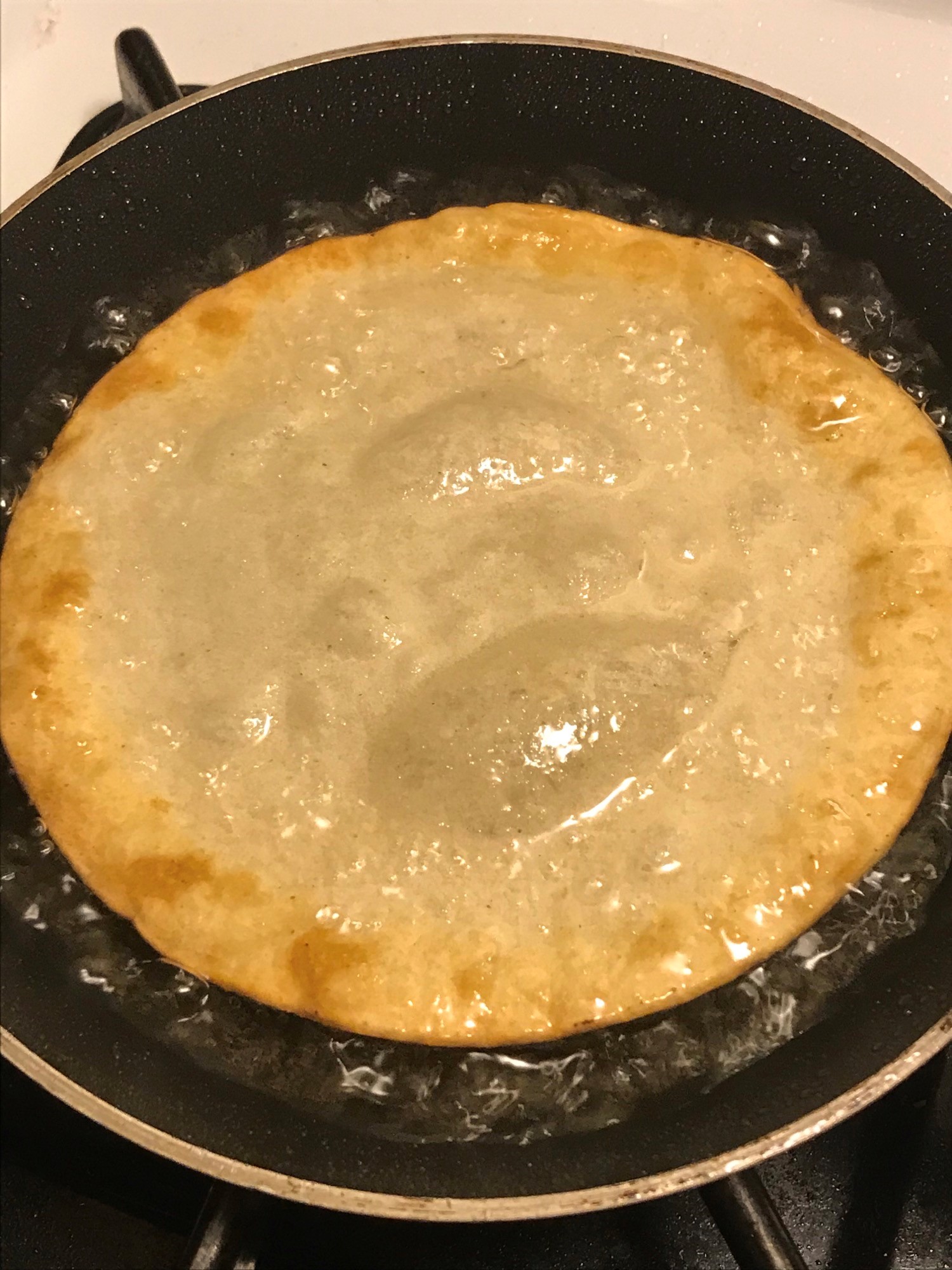 Step 1) Pour vegetable oil 1/2 inch deep in a small frying pan. Heat over medium flame until bubbles begin to form along the sides of the pan. Then, use a metal tongs to gently lower a corn tortilla into the oil. Fry for 30 – 45 seconds on each side until tortilla is crisp and golden brown. Allow to cool on a wire rack. Repeat with remaining tortillas.
