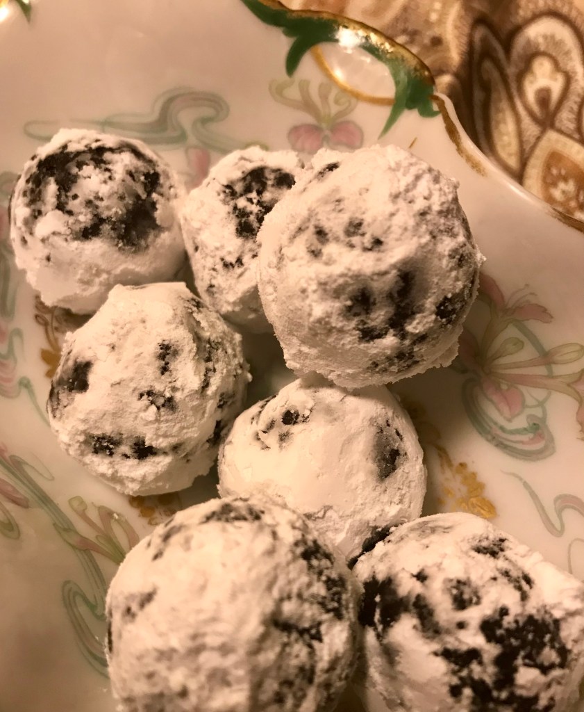 Step 3) (Wear kitchen gloves – this is easy but messy!) Roll mixture into small (bite sized) balls. Then, roll balls in confectioner’s sugar. That’s it!