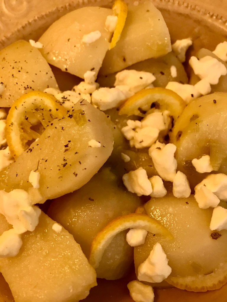 Step 4) Sprinkle cooked potatoes with sauteed leeks and feta cheese. Squeeze juice from 1/3 of a fresh lemon over the top. Then, slice a few shavings from the squeezed lemon. Add lemon shavings to potatoes. Garnish with dried oregano. Serve immediately.
