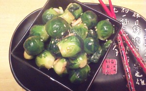 Step 1) Combine Brussels sprouts, sesame oil, and water in a shallow pan with a tight fitting lid.  Cover and cook over high heat for 5 minutes.  Shake pan occasionally so that Brussels sprouts don’t stick to the bottom, but do not lift the lid!