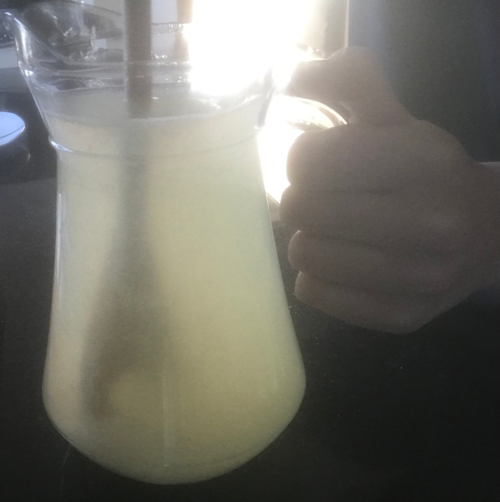 Serve. If you would like, you can use that half of the lemon you saved to make garnishes on the edge of your cups. If not, don’t juice it. I experimented and 8 halves of lemon is just too much. If you are using regular, not Mediterranean lemons, you can probably juice the last half.