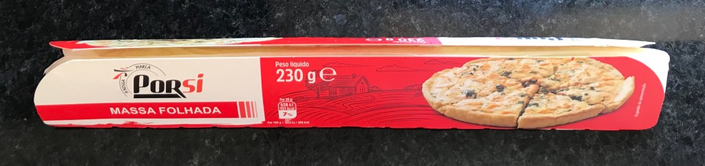 At a market in Portugal, I bought this frozen dough without knowing for certain what it actually was. My Portuguese is very limited (“Where is the restroom? Do you accept credit cards? Will you please clean the fish? Excuse me, thank you, have a good afternoon.”), and while I know the words for market basics such as apples and fish, massa folhada was unknown. I took a chance that it would be something interesting (pie dough? Cornmeal crust?) and added it to my basket. Turns out it’s puff pastry. Score!