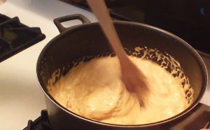 Step 4) When your boiling mixture reaches the Hard Crack stage, turn off the heat and sprinkle baking soda into the pot. STIR QUICKLY! A chemical reaction will take place, causing the boiling mixture to foam and froth. This is normal – and exciting!
