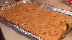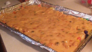 Step 5) After stirring, pour mixture over jelly beans. Working quickly, spread mixture evenly over the entire pan.