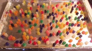 Step 3) While your mixture boils, prepare your pan. First, cover your largest baking pan with aluminum foil; don’t forget to cover the sides. Next, grease the aluminum foil with the wrapper from a stick of butter. Then, evenly distribute jelly beans on the foil.