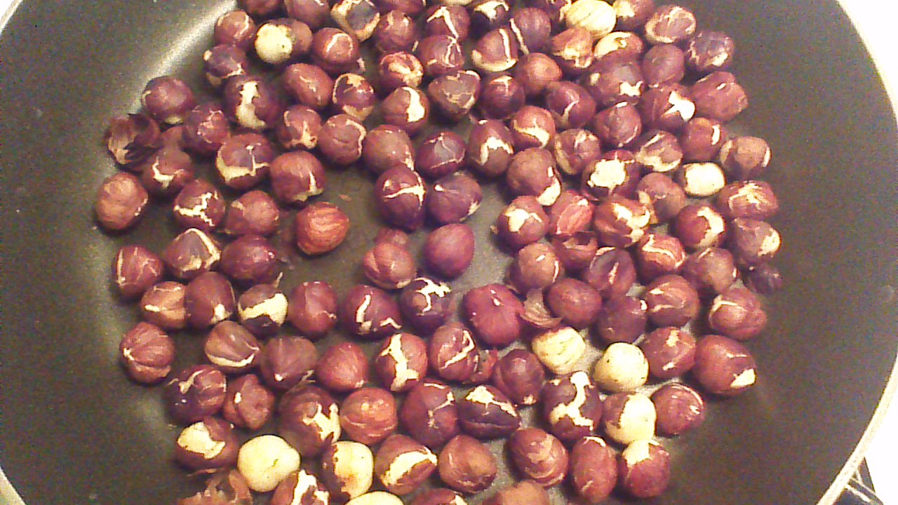 Step 1) Toast hazelnuts in a dry pan over medium heat for 3-5 minutes, stirring or shaking the pan constantly.