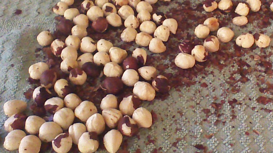 Step 2) Remove brown skins from hazelnuts by placing toasted nuts on an old towel. Fold the towel so that the towel is both above and below the nuts, and rub your hands vigorously on the top of the towel. The brown skins will slip off easily.