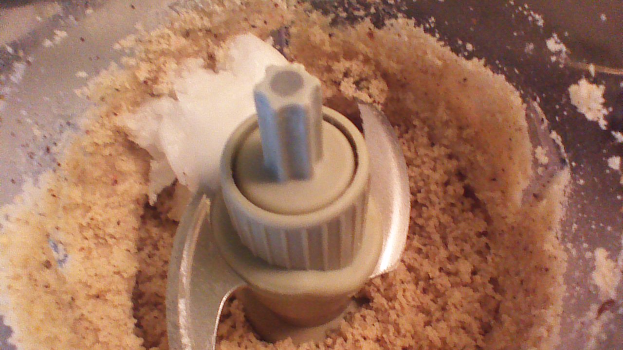 Step 3) Grind hazelnuts in a blender or food processor until smooth, like peanut butter. Add coconut oil, powdered sugar, almond extract, and salt. Blend well.