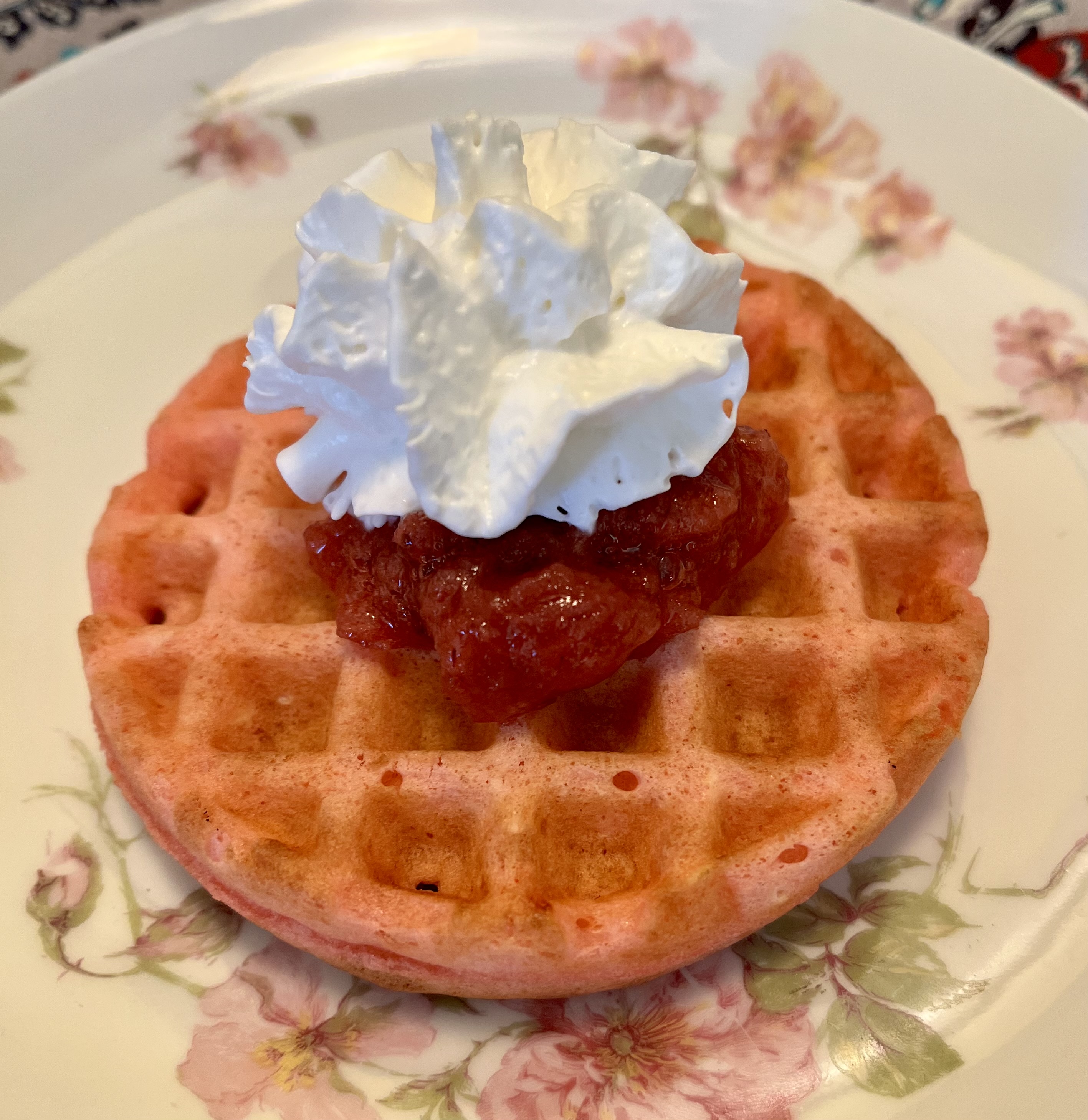 Step 3) Serve waffles with whatever toppings make you smile, such as strawberry jam and whipped cream.