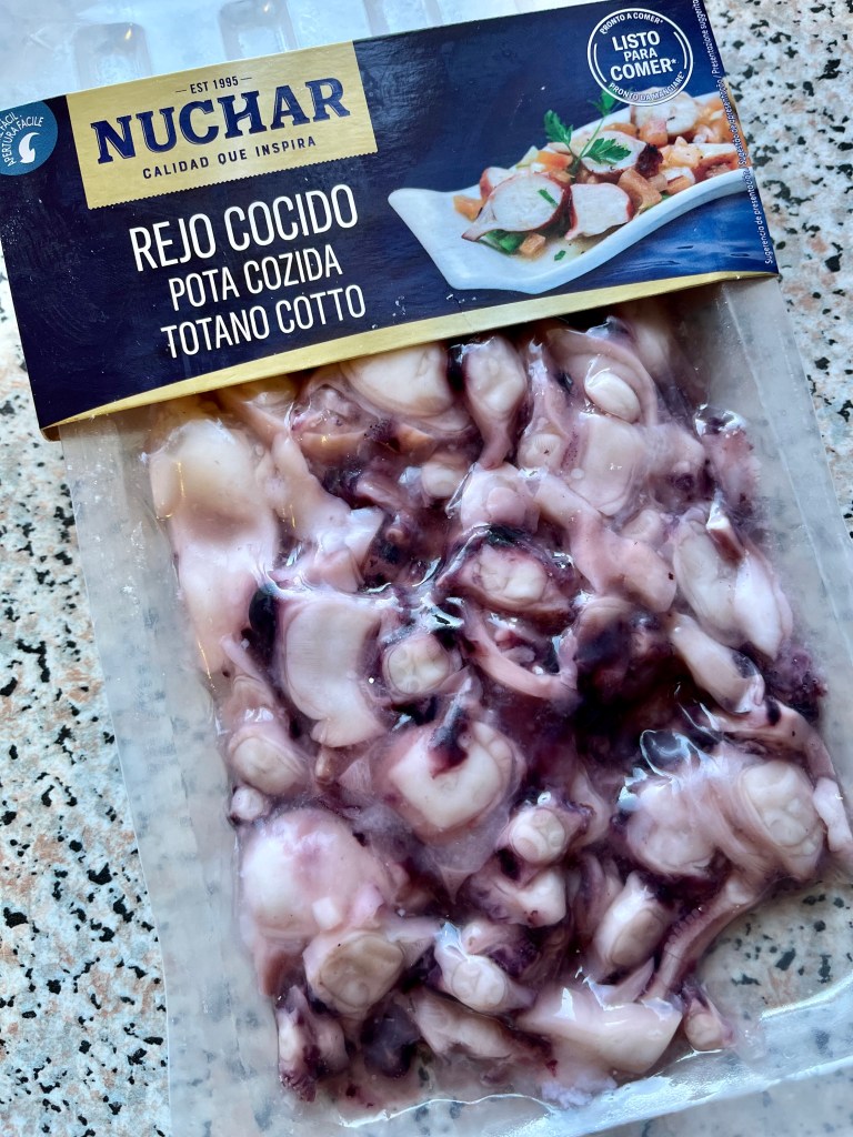 First things first. The word paella is like the word soup – it conjures a thousand different but equally delicious flavor combinations in the minds of a thousand different people. This simple version of a Spanish classic does not require a special pan, and requires only about 30 to 40 minutes from start to finish. We are using thinly sliced squid because Half-Pint found the package below at the Portuguese market and asked to try. It was delicious! If squid is not your favorite, or is not available in your area, feel free to substitute any combination of shrimp, sliced chourico sausage, cooked chicken, or whatever protein catches your fancy. If you don’t need a giant pan of paella, just cut the recipe in half. 😉