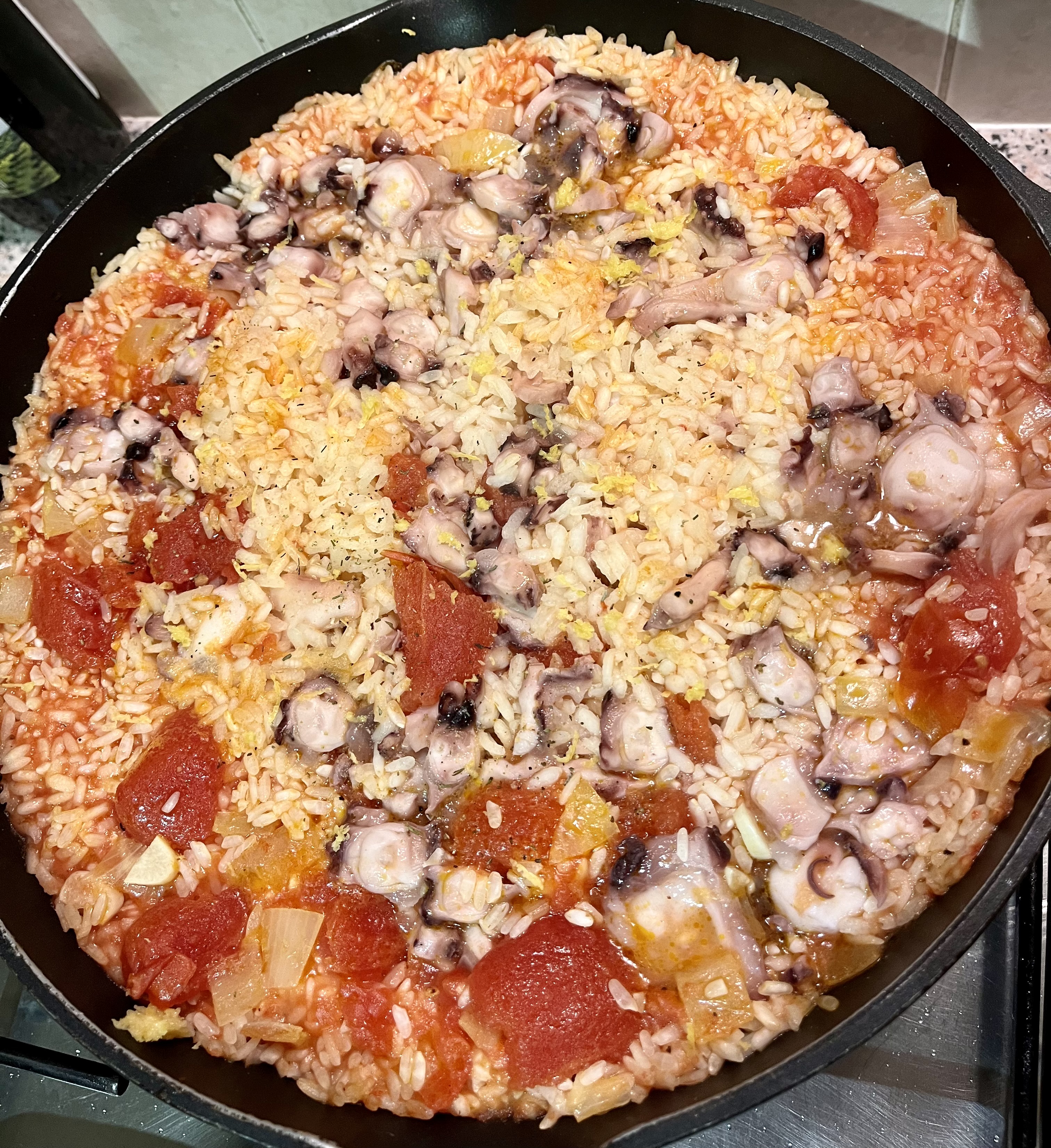 Step 6) When the rice is cooked to your liking and most (but not all!) of the chicken stock has been absorbed, layer your squid over the entire pan and press gently into the rice. Squid cooks very fast… cover the pan and allow to cook for two minutes. Then, remove from heat but keep the pan covered for an additional five minutes.