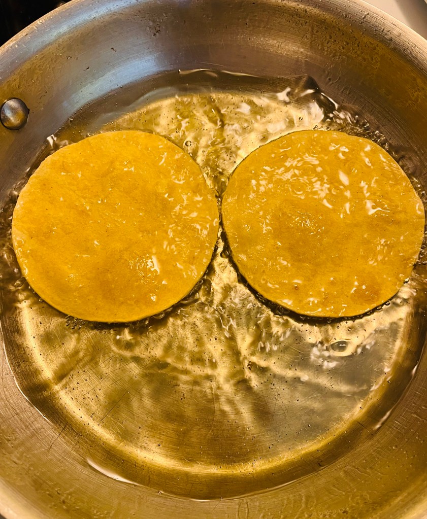 Step 2) Heat vegetable oil in a skillet over high heat. Fry the corn tortillas, 1 – 3 at a time as space permits, for approximately 10 seconds on each side (if they bend when you remove them from the oil, give them a few more seconds). Set on a wire rack to cool and drain. Tip: sprinkle a drop of two of water into the oil before adding your first tortilla shell. The drop of water should sizzle loudly and immediately – if it does not, your oil isn’t hot enough yet!