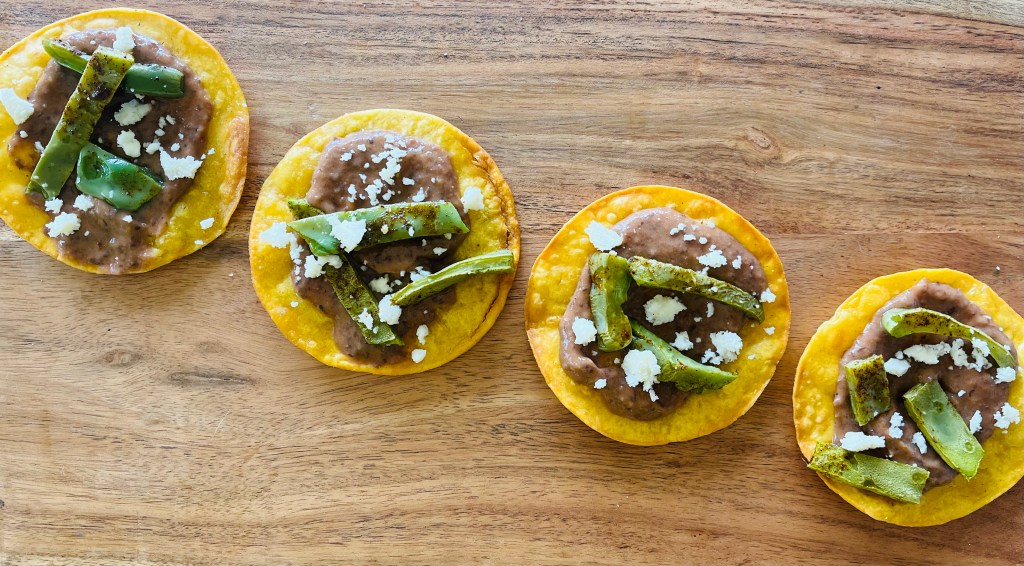 Step 6) To serve your tostadas de nopales, smear a bit of the black bean and salsa puree over each tostada shell. Top with a few fried nopale slices, and sprinkle with queijo fresco. So simple! So delicious!