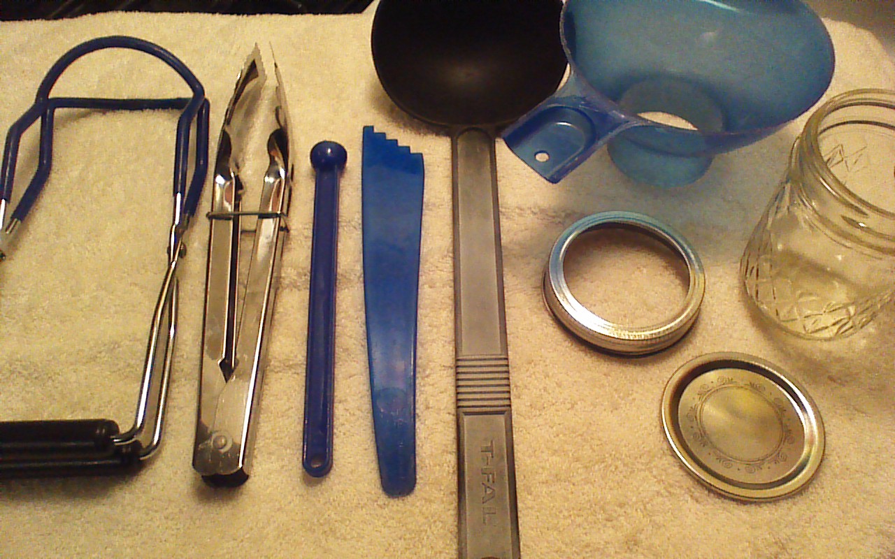 Step 1) Gather your supplies. From left to right, the supplies shown are a jar grabber, tongs, stick magnet, headspace measuring tool, ladle, wide mouth funnel, and three part jar (screw band, flat sealing lid, and the jar itself). Make sure all of these items, along with your countertop, are scrupulously clean.