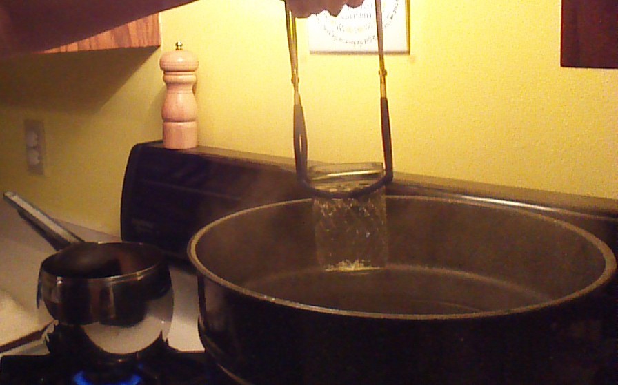 Step 4) Using your jar grabber, remove a jar from the boiling water and empty it either back into the canning pot (be careful) or into your sink. If you are canning multiple jars, put half the water in the pot, and half the water in your sink. Set the jar on a protected surface. It will be HOT!