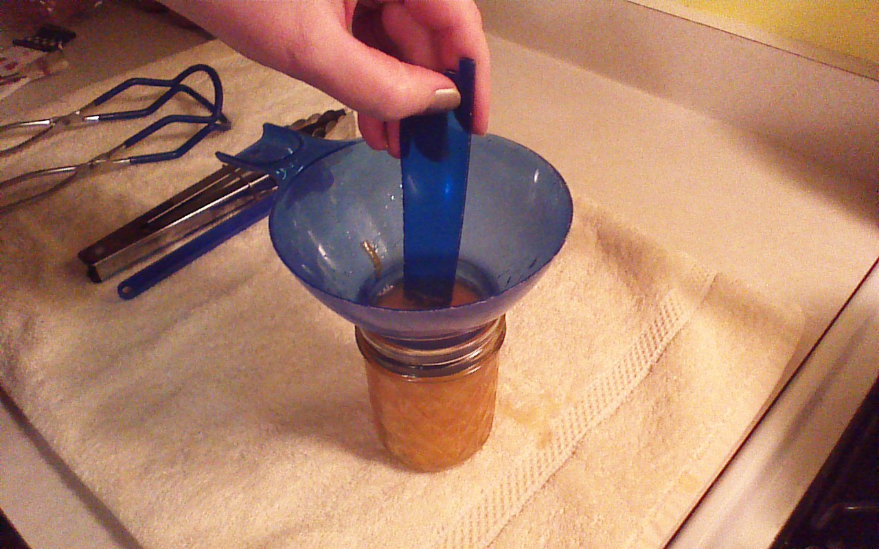 Step 5) Place your clean, wide mouth funnel in the jar and ladle your recipe into the jar. Do not fill all the way to the top; your recipe should tell you how much empty space or “headspace” to leave. 1/2 inch is pretty standard, if your recipe doesn’t specify.