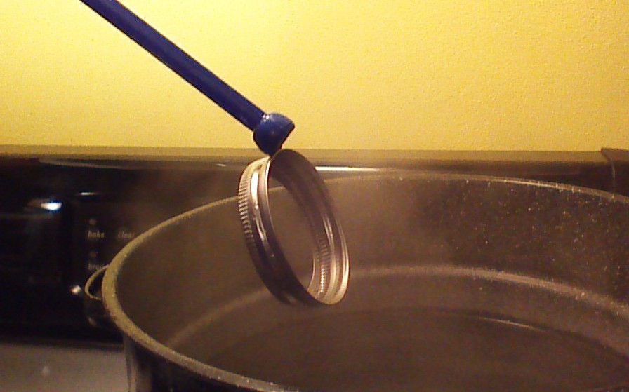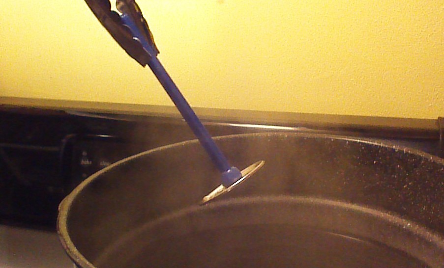 Step 9) Use your stick magnet to remove the flat sealing lid from the boiling water. Don’t burn yourself… use the tongs to hold the magnet stick if needed.