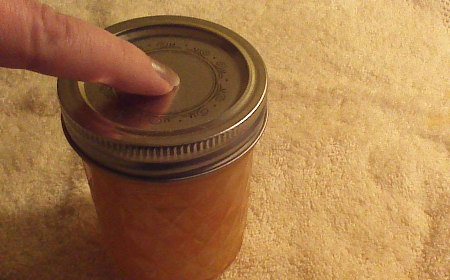 Step 14) Remove your jar(s) from the boiling water and set on a protected surface to cool for 24 hours. Do not disturb your jars for 24 hours. Before storing, check to see that your jars have all sealed. The middle of the flat sealing lid should be indented, and should not move or make any sound when you press down. If a jar has not sealed, store it in your refrigerator. Sealed jars may be stored in a cool, dry place for a long time – one year is pretty standard.